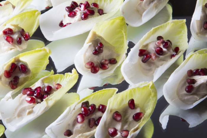 Endive leaf filled with babaganoush topped with pomegranate seeds.